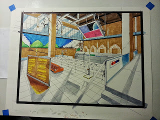 I'm going to school at the moment and this was a homework project for one of my classes. It's 11x24 so I took a picture of it. It was too big to scan. Pencil, ink and prismacolor markers.